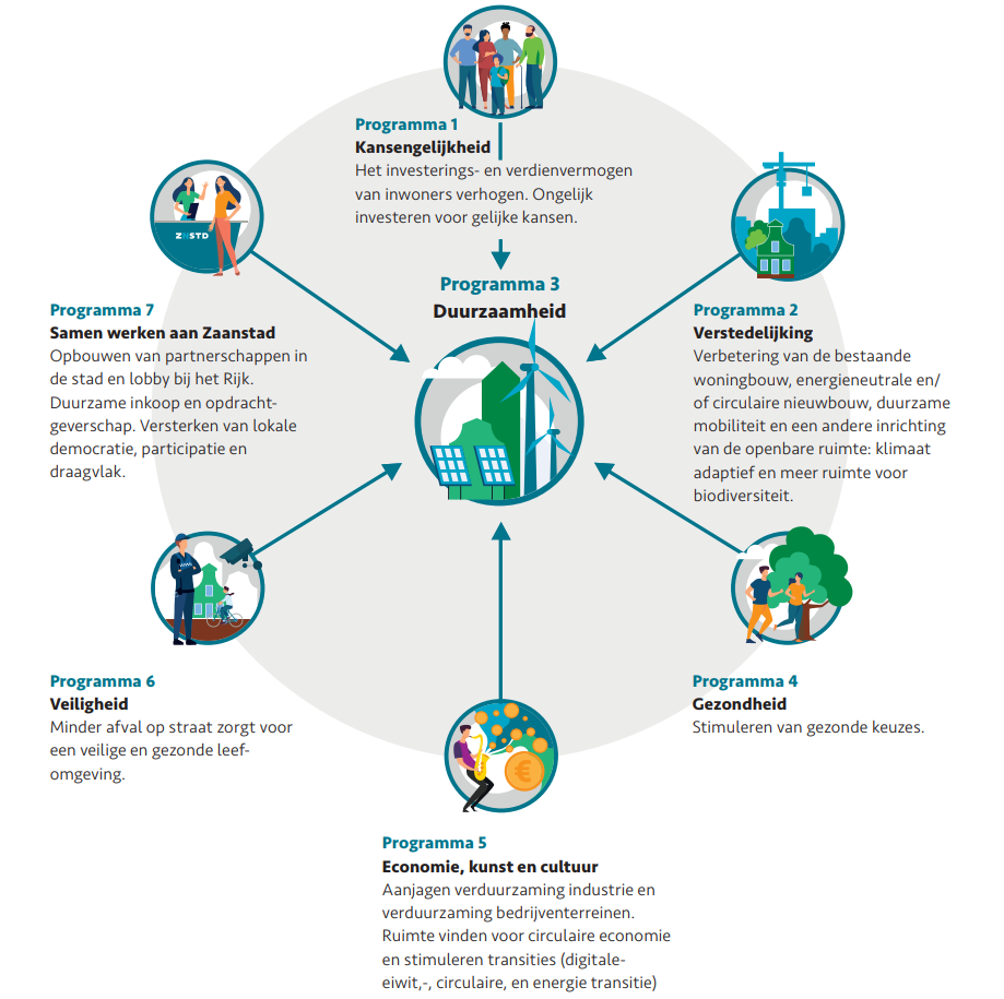 Duurzaamheid is een randvoorwaarde voor een toekomstbestendig Zaanstad waar bewoners in goede gezondheid leven. Duurzaamheid heeft ook andere programma’s nodig om haar doelstellingen te behalen. Kansengelijkheid : door kansengelijkheid te bevorderen vergroten we het investerings- en verdienvermogen van mensen. We investeren ongelijk voor gelijke kansen. Hierdoor kunnen Zaankanters beter deelnemen aan de energietransitie, de grondstoffentransitie en zich aanpassen aan het veranderende klimaat. Verstedelijking : een gezonde klimaatbestendige leefomgeving kunnen we alleen realiseren met een verbetering en verduurzaming van de bestaande woningvoorraad, energieneutrale en/of circulaire nieuwbouw. Met duurzame mobiliteit en een andere inrichting van de openbare ruimte waar boven- en ondergronds ruimte is voor groen, water en de inpassing van energie-infrastructuur. Voor het realiseren van een duurzaam Zaanstad is fysieke ruimte nodig in de stad. Dat vraagt om een integrale afweging bij ruimtelijke initiatieven. Voor het aardgasvrij maken van de gebouwde omgeving en verduurzaming van mobiliteit is mobiliteit met de opgave verstedelijking noodzakelijk. Gezondheid : vanuit het programma Gezondheid stimuleren we bewoners om gezonde keuzes te maken. Waar dat leidt tot bijvoorbeeld meer fietsen, draagt dit bij aan de transitie naar duurzamere mobiliteit. Een gezamenlijke uitdaging voor beide programma’s kan in de toekomst liggen in de voedsel-/eiwittransitie. Economie, kunst en cultuur : om de duurzaamheidstransities mogelijk te maken, is een strategische uitwerking met het bedrijfsleven nodig. Voor het bedrijfsleven, waaronder de grote industriële bedrijven in Zaanstad, wordt verduurzaming - ook door eigen opwekking van duurzame energie - steeds meer een economisch voordeel en onderdeel van de toekomstbestendigheid. Er moet voldoende menskracht zijn, wat aandacht vraagt op het gebied van arbeidsmarkt en opleidingen. Veiligheid : Samen werken aan Zaanstad : Zaanstad kan zijn duurzaamheidsdoelstelling alleen behalen samen met partners in de stad. Het is daarom van belang om partnerschappen op te bouwen. We versterken lokale democratie, participatie en draagvlak. Ook gaan we verder met het opnemen van duurzaamheidscriteria bij inkoop en aanbestedingen en duurzaamheid standaard mee te nemen in de gemeentelijke besluitvorming. En lobbyen we voor rijksgelden om de duurzaamheidstransities te bekostigen. |