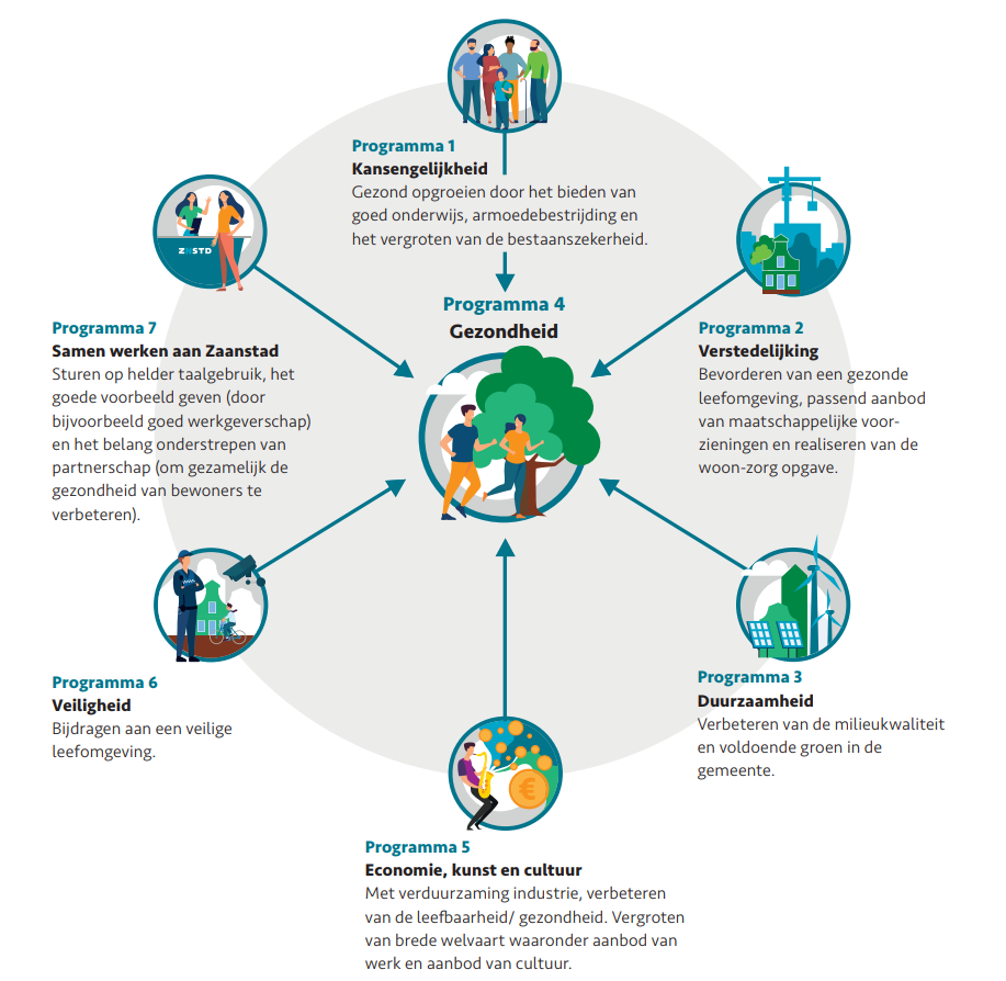 Er zijn veel factoren van invloed op het welbevinden en de gezondheid van mensen. Daarom is een gecombineerde aanpak nodig die de afzonderlijke begrotingsprogramma’s overstijgt: Kansengelijkheid draagt bij aan een betere gezondheid door het bieden van goed onderwijs – inclusief voorschool, kinderopvang en een goede begeleiding van ouders. Dat is cruciaal voor een goede ontwikkeling van (hele jonge) kinderen, en is een van de meest effectieve manieren om via preventie bij te dragen aan gezondheid. Ook draagt het programma Kansengelijkheid bij aan gezondheid en het verminderen van stress via armoedebestrijding en het vergroten van de bestaanszekerheid. Verstedelijking draagt bij aan de opgave Gezondheid door het bevorderen van een gezonde leefomgeving. Daarbij gaat het onder andere over de inrichting van de openbare ruimte: denk aan ruimte voor sport en bewegen, ontmoeten, groen voor ontspanning en tegengaan hittestress. Verder draagt verstedelijking aan gezondheid bij via het aanbod van maatschappelijke voorzieningen en het realiseren van de woonzorgopgave voor mensen in kwetsbare situaties. Dat is ook belangrijk met het oog op de groei van de stad en dorpen. Ook duurzame mobiliteit draagt bij aan gezondheid. Duurzaamheid werkt aan het verbeteren van de milieukwaliteit (luchtkwaliteit, geluid, geur en bodem); dit draagt bij aan de gezondheid van onze inwoners. Verder zijn er vooral koppelkansen rond het toevoegen van groen in de stad en dorpen; dat is nodig vanwege de klimaatadaptatie maar helpt ook in het tegengaan van hittestress, bijvoorbeeld bij ouderen. Groen dat stimuleert tot recreatie en beweging draagt bij aan gezondheid omdat het stress kan reduceren. Verder kan het verduurzamen van woningen leiden tot een gezonder binnenklimaat. Economie, kunst en cultuur zet in op het vergroten van de brede welvaart; daar is gezondheid een van de aspecten van. Ook het hebben van werk heeft voor veel mensen een positieve invloed op gezondheid; een grote gezamenlijke uitdaging is de krapte op de arbeidsmarkt in de zorg. Verder kan ook cultuur, onderdeel van het programma Economie, enorm bijdragen aan het welbevinden en de gezondheid van mensen. Ook Veiligheid draagt bij aan gezondheid, doordat repressie en handhaving ervoor zorgen dat inwoners zich veiliger kunnen voelen en minder angst of stress ervaren dan in een onveilige leefomgeving. Gezamenlijke uitdaging voor de beide programma’s is een meer preventieve aanpak, de ketensamenwerking Zorg & Veiligheid en het tegengaan van polarisatie en discriminatie. Samen werken aan Zaanstad draagt bij aan gezondheid door bijvoorbeeld te sturen op helder taalgebruik, goede bejegening, zo min mogelijk administratieve handelingen voor mensen die ondersteuning nodig hebben en toegankelijkheid van zorg & ondersteuning in de wijken. Ook gaat het over de voorbeeldrol die bestuur en organisatie hebben. Dat doen we onder meer door in te zetten op goed werkgeverschap: zaken als goede arbeidsvoorwaarden en een juiste balans tussen werk en privé is belangrijk voor de gezondheid van onze medewerkers. We zetten in op ervaringsdeskundigheid en stellen het perspectief van de inwoners centraal, waarbij we onderscheid maken naar doelgroep indien wenselijk. Verder is partnerschap een belangrijk element in het programma Samenwerken aan Zaanstad; dat draagt ook bij aan de opgave Gezondheid omdat we alleen gezamenlijk de gezondheid van bewoners kunnen verbeteren en de verschillen kunnen verkleinen. |