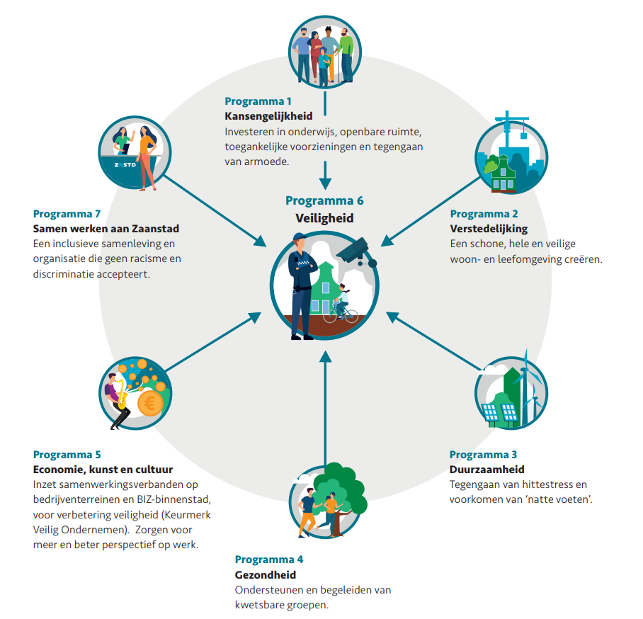 Kansengelijkheid : de focus ligt op preventie en jeugd. We investeren in de talentontwikkeling van kinderen, het tegengaan van armoede, in de openbare ruimte en toegankelijke voorzieningen. Kansrijke factoren om zo jeugdcriminaliteit en jongerenoverlast te voorkomen. Verstedelijking : wanneer we onze (openbare) ruimte ontwerpen, nemen we fysieke en sociale uitgangspunten op. Met als doel een schone, hele en veilige woon- en leefomgeving. Dit draagt bij aan een veilige omgeving en veilig gevoel. Duurzaamheid : door in te zetten op klimaatadaptatie en CO2-reductie zorgen we voor een veilig leef- en werkklimaat voor alle Zaankanters, nu en in de toekomst. Gezondheid ; we richten ons op het bieden van ondersteuning en begeleiding aan kwetsbare groepen. Dit kan bijdragen aan meer veiligheid van mensen zelf en voor anderen; denk aan het tegengaan geweld in de thuissituatie, begeleiding van mensen met een drugsverslaving, ondersteuning van jongeren met ernstige gedragsproblemen, opvang voor mensen die dak- of thuisloos zijn. Economie, kunst en cultuur : als Zaankanters meer en beter perspectief hebben op werk - inclusief stageplekken en leer-/werkplaatsen - draagt dat bij aan meer veiligheid. We bieden zo een alternatief voor de verleiding van de criminaliteit. Hierbij hebben we extra aandacht voor kwetsbare groepen, als jongeren en (arbeids)migranten. Samen werken aan Zaanstad : we willen als Zaanstad een inclusieve samenleving en organisatie zijn. We accepteren geen racisme, straatintimidatie en discriminatie. Iedereen moet zichzelf kunnen zijn. En zich veilig voelen in Zaanstad, ongeacht gender, leeftijd, geloof, culturele identiteit of seksuele oriëntatie. |