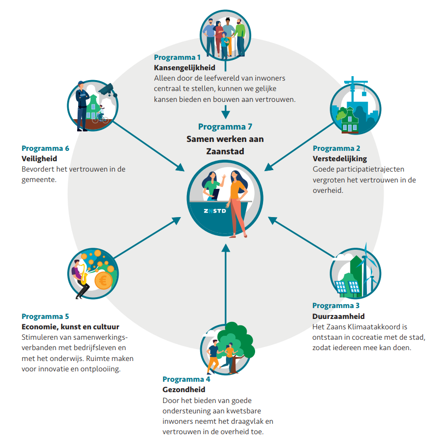 We gaan meer voor elkaar krijgen door ons nog meer bewust te zijn van onze rol. Ook werken we aan een lobbystrategie, omdat onze impact steeds vaker afhangt van samenwerking met andere overheden. We willen aansluiten bij wat leeft in de samenleving, de verschillende belangen identificeren en inzicht geven in de belangenafweging die we maken. Zo dragen we bij aan het herstel van vertrouwen in de overheid. Dit programma maakt het mogelijk uitvoering te geven aan de opgaven en maatschappelijke vraagstukken. Door te faciliteren, dienstverlenend te zijn en kaders te stellen. De opgaven vragen niet alleen om inzet van de gemeente maar vooral ook inzet van de kracht en energie in de Zaanse samenleving. We stimuleren daarom actief burgerschap. |
